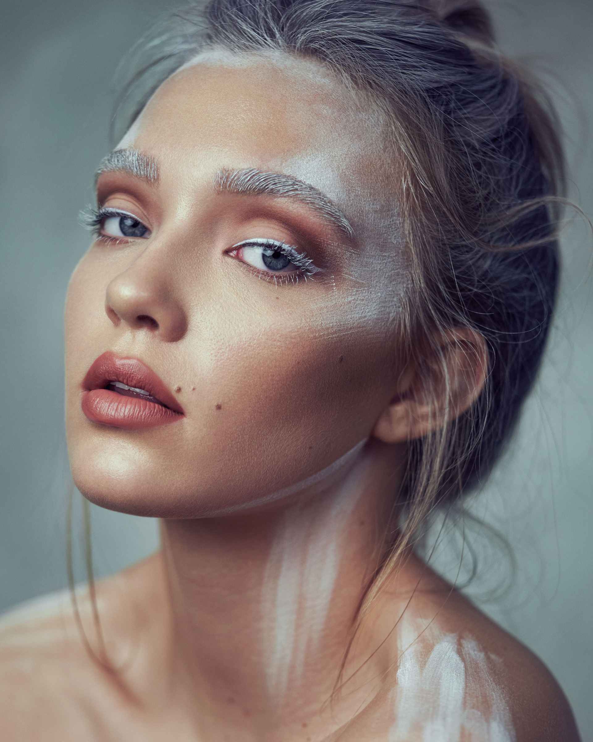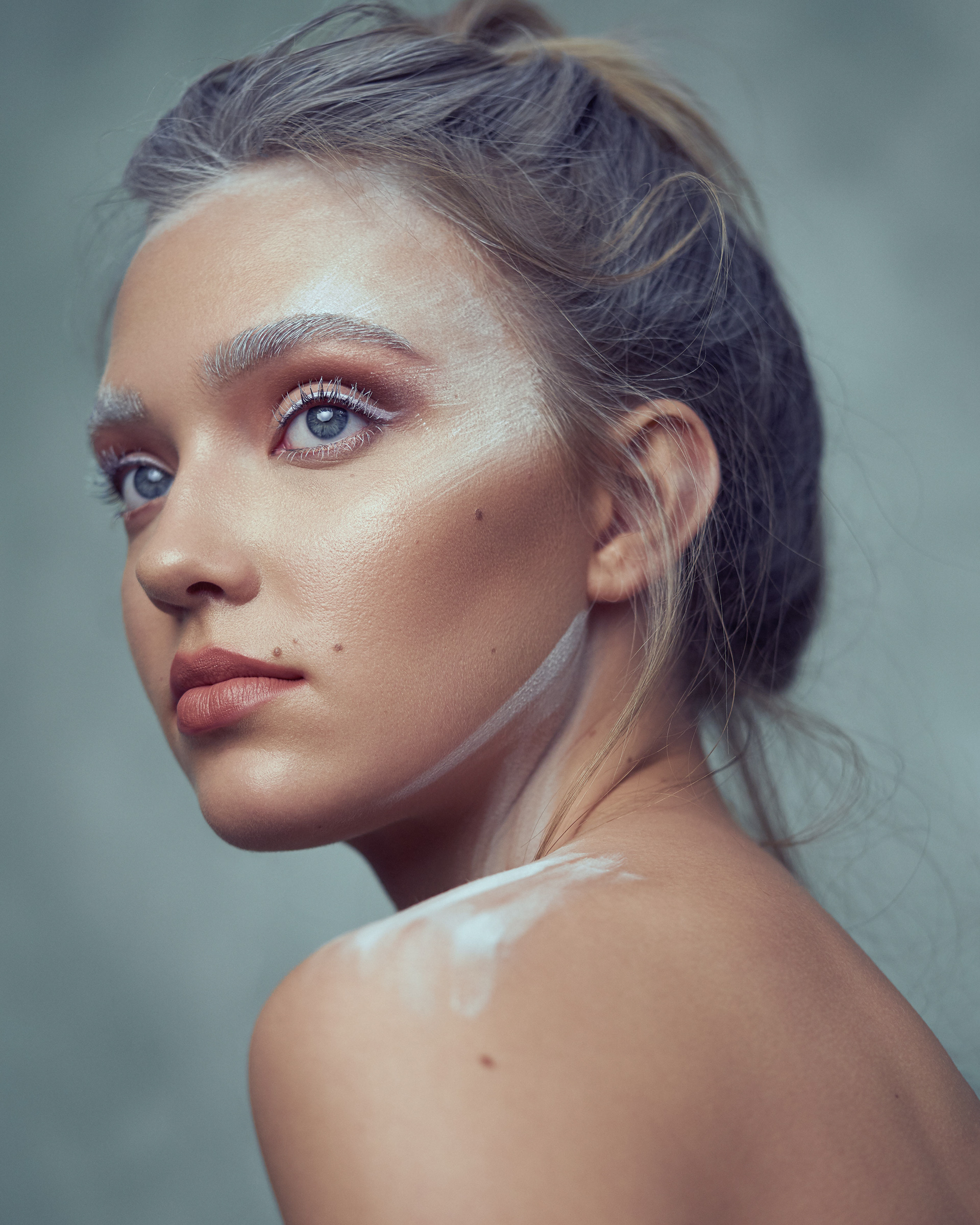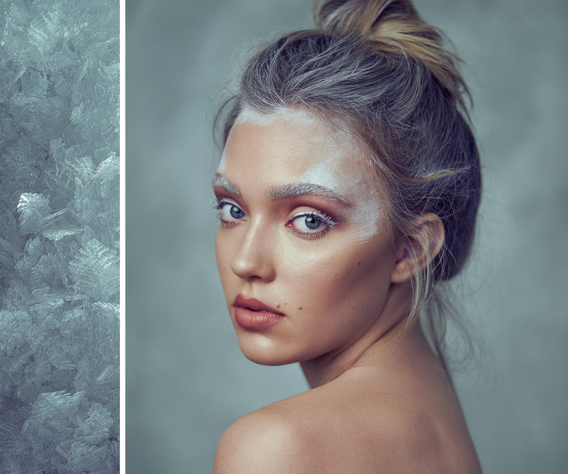 Skin was refined with minimal interference to preserve natural texture. The color palette blends blue-green, red-violet, and yellow-orange into a balanced triadic scheme that creates a frost-toned mood.