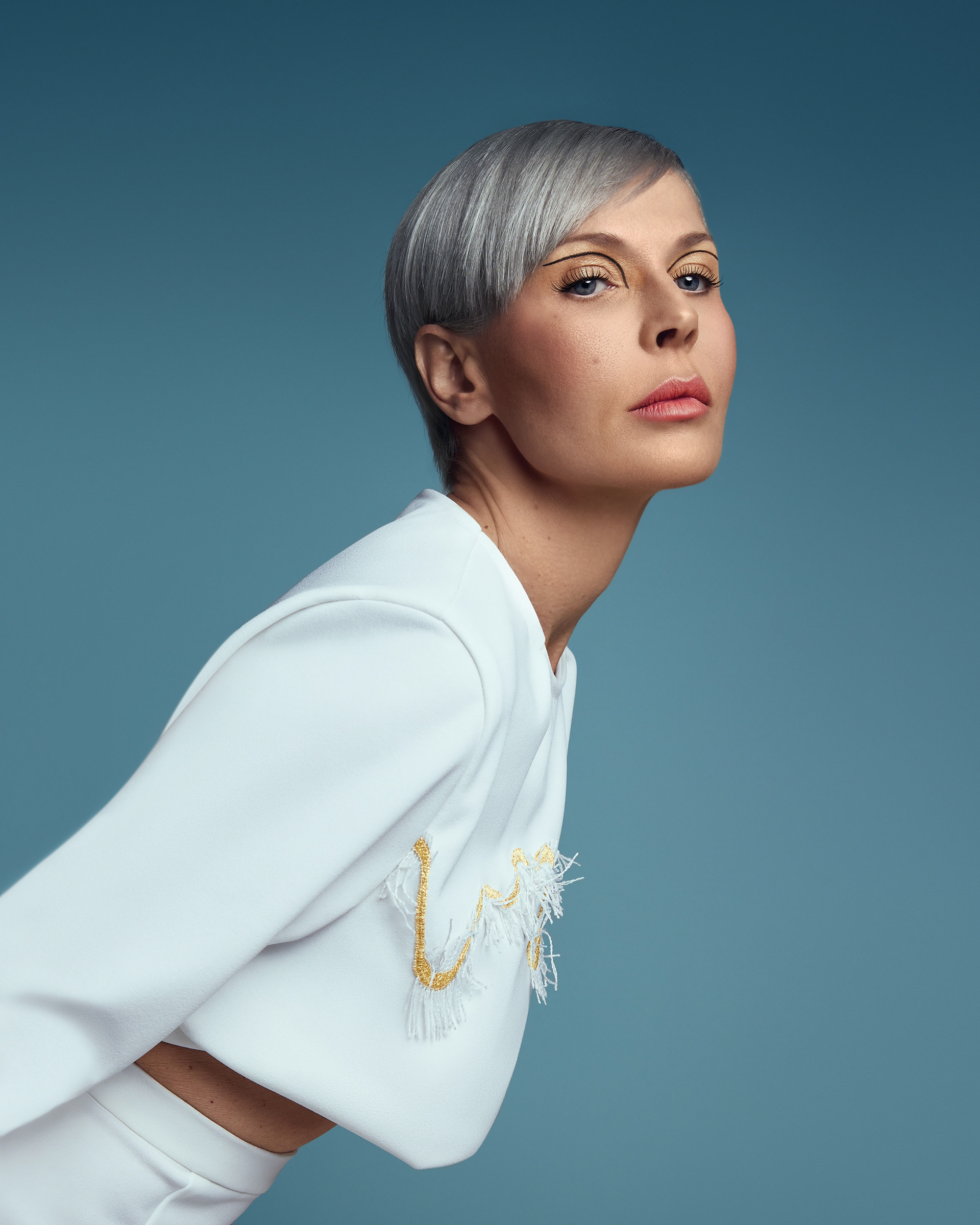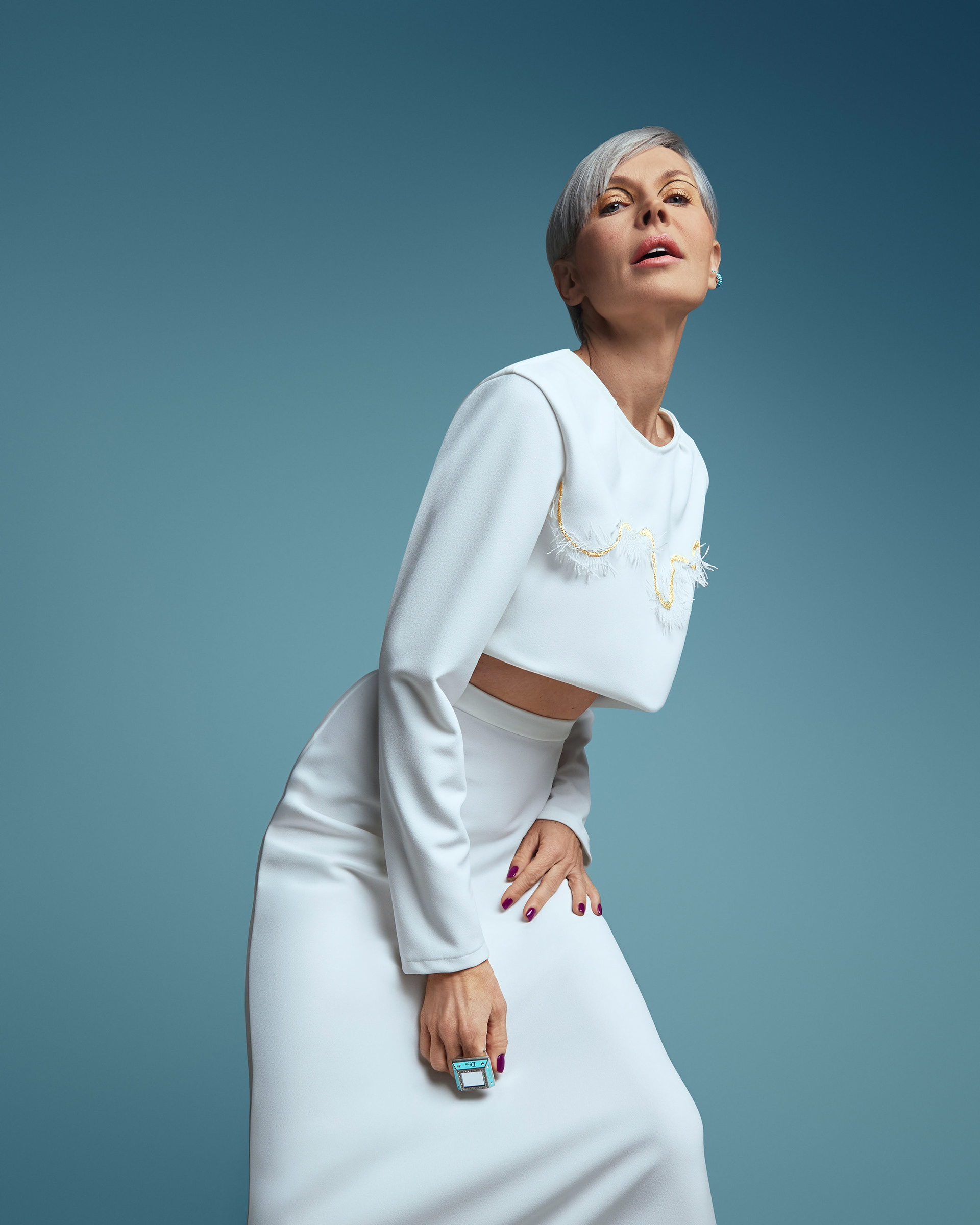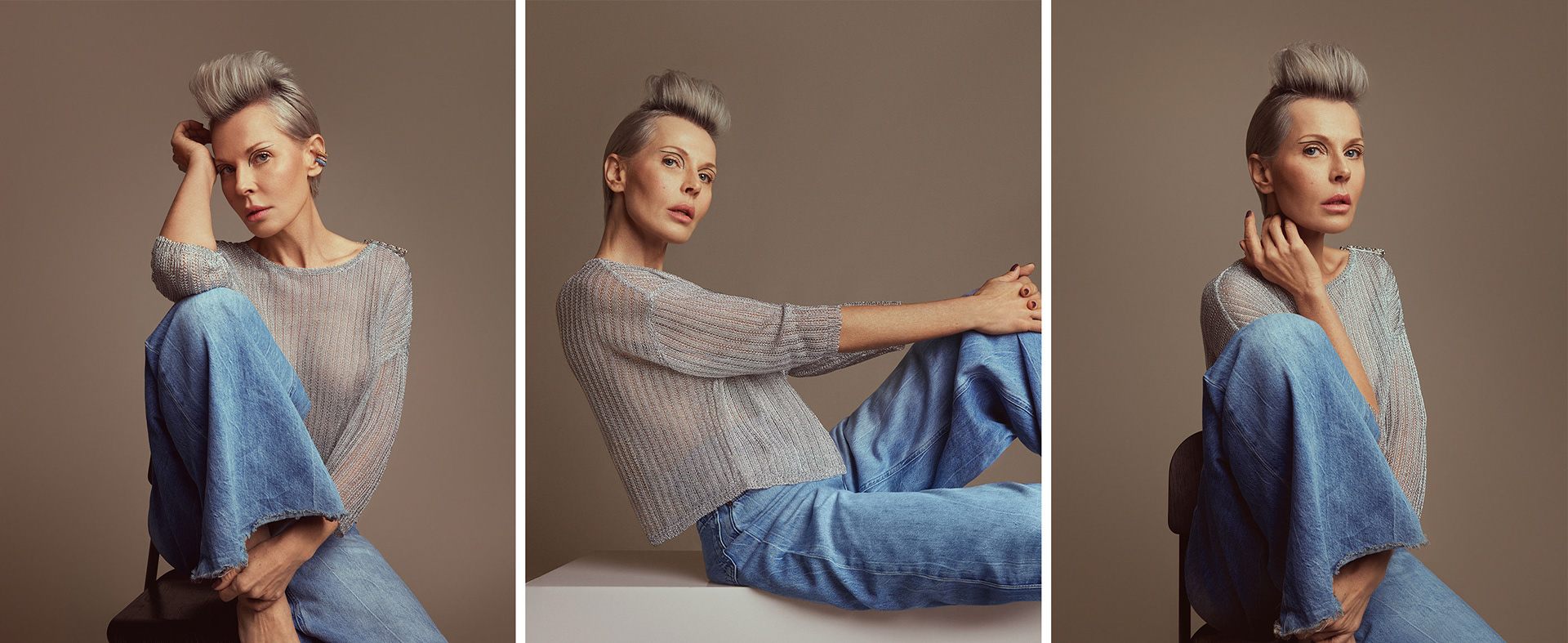 Skin cleanup, color correction and grading. I built this set around a triadic color scheme: blue-green, yellow-orange, and red-violet. The cool blue-green backdrop sets a calm tone, while the yellow-orange embroidery and red-violet makeup details (lips and nails) add warmth and energy without overwhelming the shot.